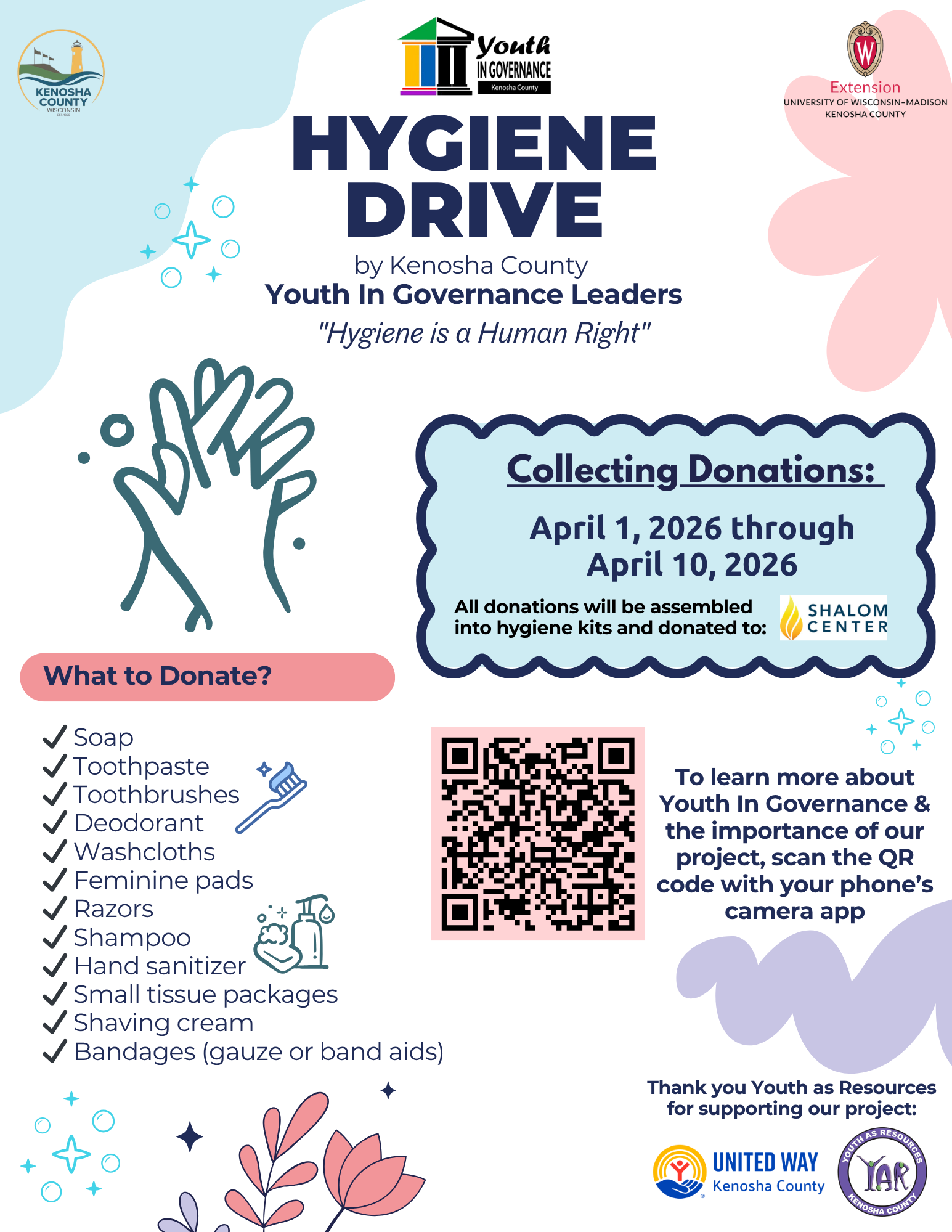 Here at the Kenosha Public Library, we believe in strengthening neighborhoods, inspiring learning, and keeping you curious. To support those goals, we’re pleased to announce that we will be supporting Youth in Governance (YIG) as they collect hygiene supplies for the Shalom Center from April 1st through April 10th.